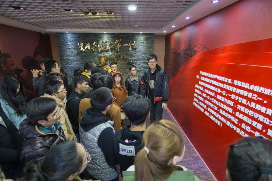 随后,我们穿过马路到达了第二站,习仲勋纪念馆。在这里,我们首先在纪念馆门口,在党旗和院旗的见证下,喊出了“不忘初心,砥砺前行”的口号。随后在7035班团支书孙时中同学的讲解与带领下,按照布展顺序,分“陕甘征程,红色传奇”,“领略西北,群众领袖”,“十年国事,炉火纯青”,“主政南粤,倡建特区”,“勤政岁月,躬身为民”,“海纳百川,情系中华”六个阶段了解了习老“天天战斗,天天快乐”的传奇一生,感受到了习老躬身为民、自始至终的满腔热血,领略了习老勇于开拓、敢于担当的人格魅力。他为我们怎样过好一生提供了参考,做出了榜样,树立了目标。