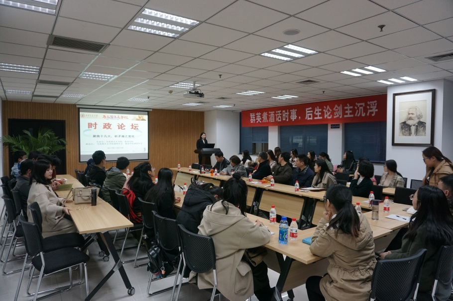 和马克思主义学院于11月22日晚7时在主E505联合举办题为“聚焦十九大,析矛盾之变化”的时政论坛,各路人马纷纷宝剑出鞘,畅谈对矛盾变化之见解,开启了一场精彩的学术盛宴。