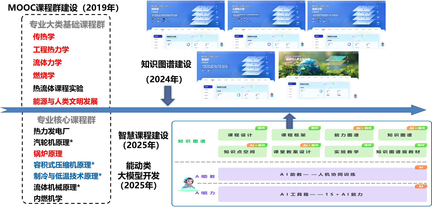 学院每年新开全校基础通识类课程,目前已建设32门(含全英文外教课程1门),其中通识类核心课课程8门、选课课程24门。在AI赋能课程建设方面,已建成传热学等5门知识图谱并在线开放,并将继续建设成AI赋能的能源动力类智慧课程。