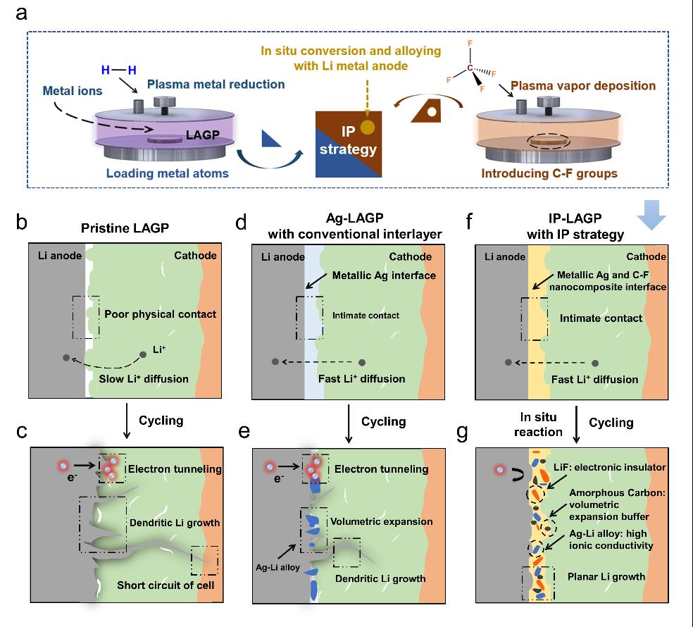 (2)凭借高能量密度和高热稳定性等优势,由固态电解质及锂金属负极组成的固态锂金属电池展现出了巨大应用潜力,被认为能从根本上解决商用锂电池中隔膜及电解液的易燃问题。然而相关研究表明,锂枝晶的无序生长会引发固态电解质内部裂纹拓展、缺陷孔隙放大,进而造成固态电池失效短路。为解决该问题,研究团队提出了一种“整合等离子体(Integration Plasma)”界面工程策略,在固态电解质表面构筑了由金属元素、电负性元素、碳元素组成的化学调节层。该人工界面层可通过与锂金属负极之间的原位反应,同步生成锂-金属合金(快离子导体)、氟化锂(电子穿梭抑制剂)、非晶态碳(体积变化缓冲剂)等化学物质,有利于实现固态电解质表面均匀的电场分布和锂沉积,从而有效阻止了锂枝晶在固态电解质内部的生长,大大延长了固态电池的循环寿命。该成果以《基于整合等离子体策略的界面化学调控实现固态锂金属电池均质化锂沉积》(Integration Plasma Strategy Controlled Interfacial Chemistry Regulation Enabling Planar Lithium Growth in Solid-State Lithium Metal Batteries)为题发表在材料领域知名期刊《先进功能材料》(Advanced Functional Materials)。