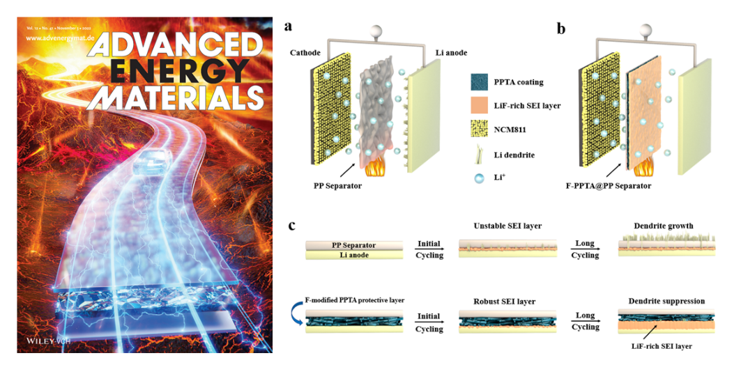 (1)考虑到市场对隔膜材料的高需求量,研究团队采用了一种简单、可大规模应用的集成化策略研发出一种高安全型芳纶涂覆隔膜并将其成功应用于三元锂金属电池、锂硫电池等高能量密度电池体系。得益于各组分间的物理-化学协同作用,该隔膜在160°C高温环境下仍能保持完成形状,在电池循环过程中能够促进锂的均匀沉积以抑制锂枝晶不可控生长。由该隔膜组装的三元锂金属电池在宽温度区间(-10-100 °C),快速充放电(30 C电流密度)等工况下的电池性能均优于常规聚合物隔膜体系。该成果以《热稳定及抗枝晶的隔膜助力实现高安全性锂金属电池》(Thermally Stable and Dendrite-Resistant Separators toward Highly Robust Lithium Metal Batteries)为题发表在能源领域知名期刊《先进能源材料》(Advanced Energy Materials),并被评为当期封面论文。